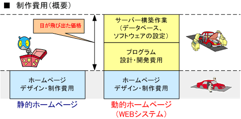 一般的に静的ホームページは外から見えるボディー部分(ホームページデザイン)の制作費用だけに対して、動的ホームページにはボディー部分(ホームページ