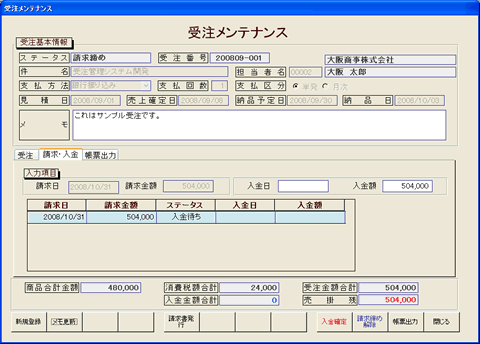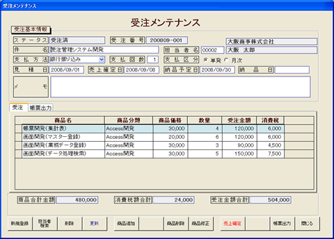 上記の受注マスタメンテナンスは月次締めのサービス業を想定した受注管理機能です。受注ステータスに応じて使用できるボタンを制御することで操作ミスをなくし、また受注状況に応じた必要な処理を視覚的に表示することで業務ミスをなくして効率の良い業務を行えるような画面です。また見積書や請求書・納品書などの帳票も印刷できるように設計しています。 |