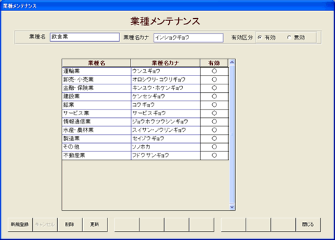上記の画面は業種区分マスタですが、「問合せ区分」や「商品分類」などはこの画面を活用します。 |