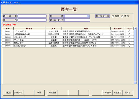顧客一覧は登録されている顧客情報を把握するための画面です。業種や住所を絞ってDM発送など登録されている顧客情報を効果的に活用します。 |
