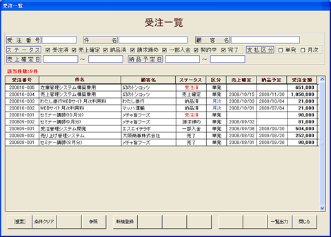 受注一覧は受注状況をステータスに応じて検索することで、業務漏れをなくして効率よく適切な処理を行うと同時に、お客様からの注文状況に対する問合せに迅速に対応できるようにしています。 |