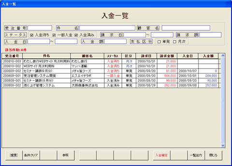 入金一覧は請求データに対する入金状況を確認するための画面です。お客様から入金があった場合、この画面より該当するデータの消しこみ(入金処理)を行えことも可能にしています。 |
