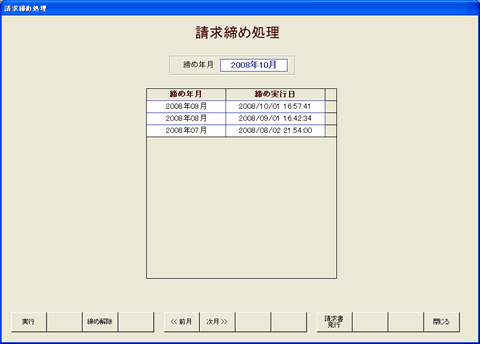 請求締め処理は1ヶ月の売上を月次で締めた後に請求書を一括で発行するというような業務に対応しています。サービスなど継続して月単位で請求するような受注データには、請求締め処理で自動的に請求データを起こしたり、締められた受注データに入金処理を行った場合には請求締め取り消し処理ができないなど、業務にそった処理が行えるように設計しています。 |